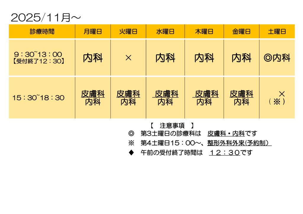 - ・2025年11月より第2㈬・第4㈬の診療時間を平日他曜日と同じ15:30~18:30に統一させていただきます。患者様のご希望もあり、小手術に関しましては皮膚科診療時間内でご希望に合わせ都度行わせていただくことといたしました。小手術(30分程度)が入った際は随時ホームページにてお知らせさせていただきますので、予約なしで来院される際はご確認の上受診していただくことをおすすめいたします。