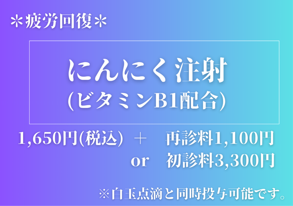 *にんにく注射(ビタミンB1配合) 1,320円(税込)※白玉点滴と同時投与も可能です。